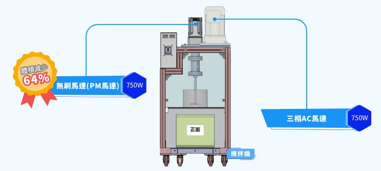 攪拌槽通常設置於設備上方,傳統使用三相AC馬達長度較長且本體較重,導致整體機構設計受限。為支撐馬達重量,機台下方常需額外補強,導致材料成本增加、體積膨脹,降低設備靈活性與設計自由度。