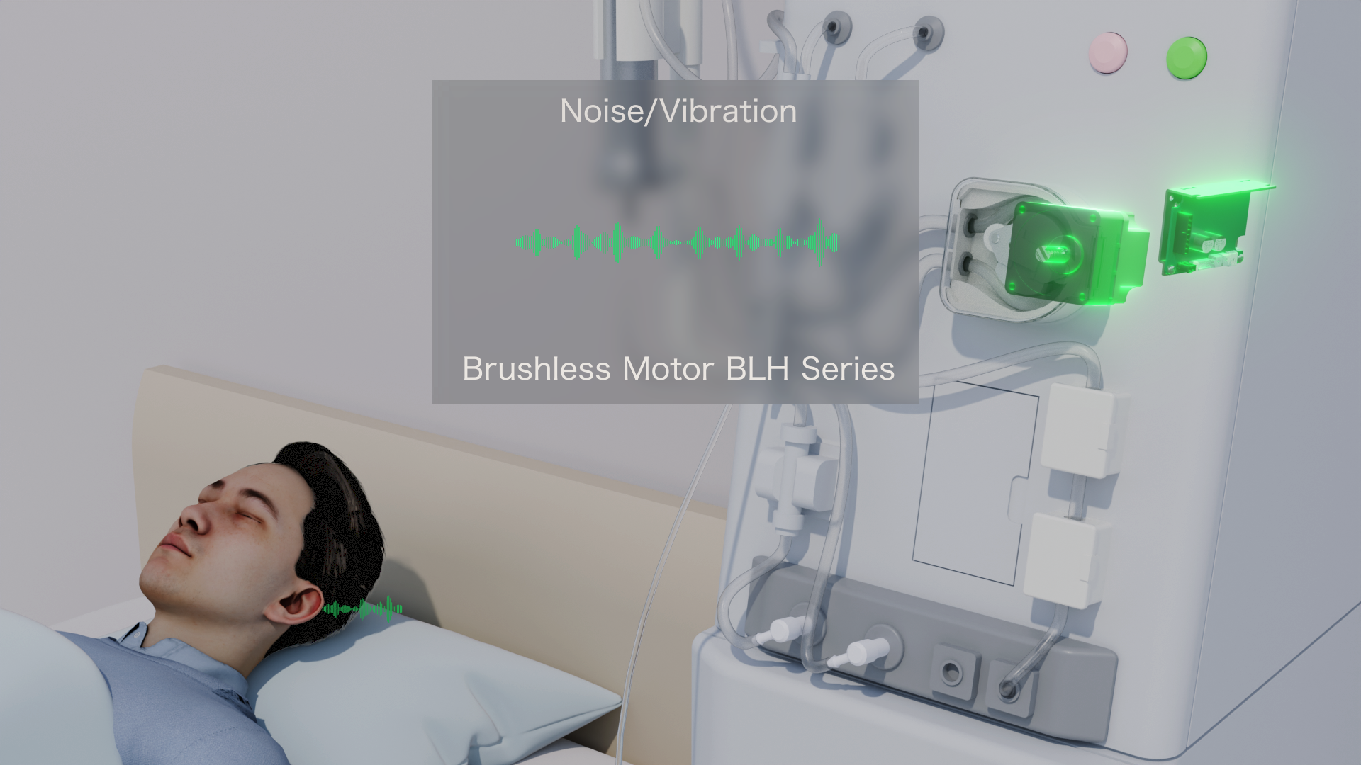- 在醫院環境中,透析設備/藥液傳輸單元常置於患者耳邊,馬達運轉聲會影響患者舒適度